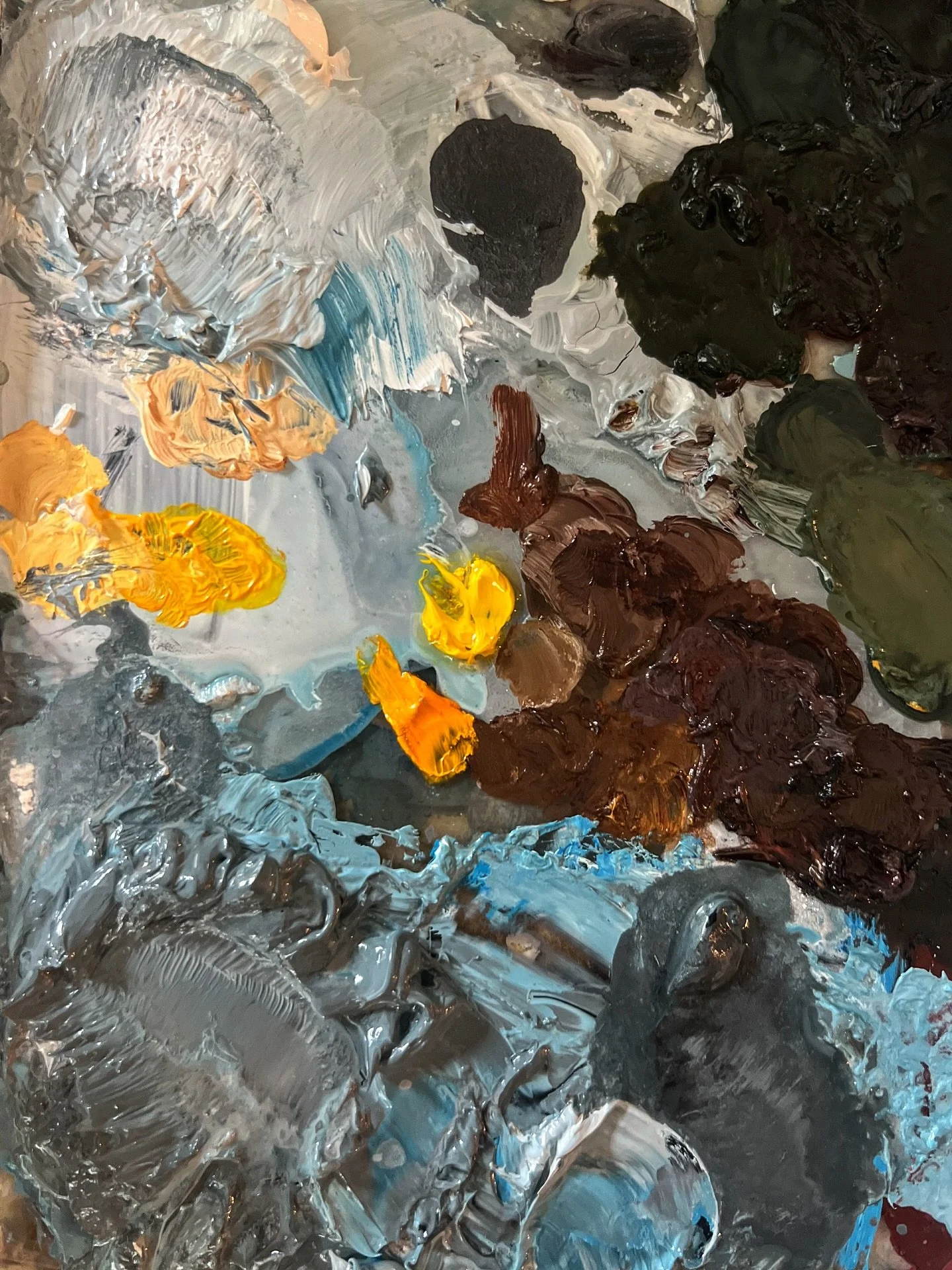 In this collection music and paintings intertwine. Each piece begins with the lyrics of a song, handwritten in charcoal on wooden panels. I layer rich oil paints overtop the lyrics that evoke the emotions and imagery of the song. The result is a haunting interplay of color and text, where the echoes of the lyrics resonate beneath the surface.
